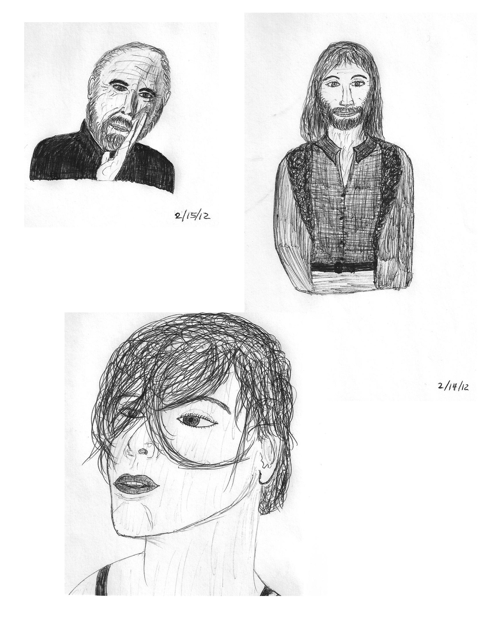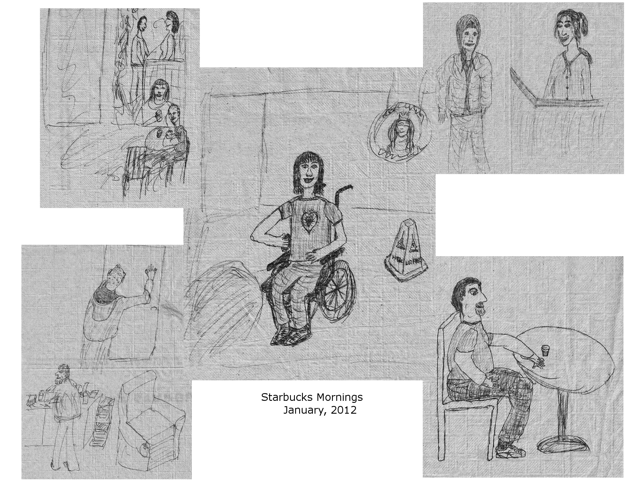 My family and I lived in a hotel for almost four weeks at the beginning of 2012. In the mornings, I would visit the nearby Starbucks, sometimes with my daughter, Mikayla. Here are some napkin drawings from those trips.
