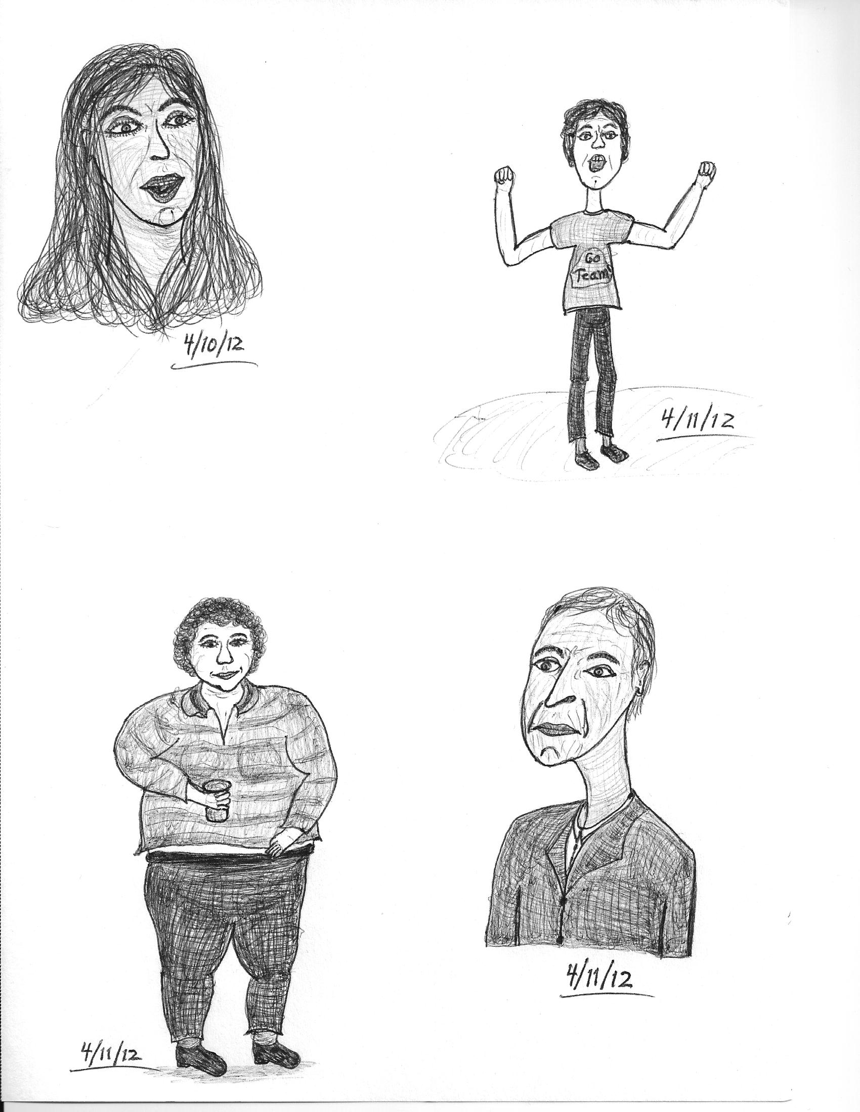 The girl with the small head had a much larger head in the reference image. By drawing her arms first, I lost perspective and didn’t leave enough space. There was no reference material for the guy I drew on a napkin.